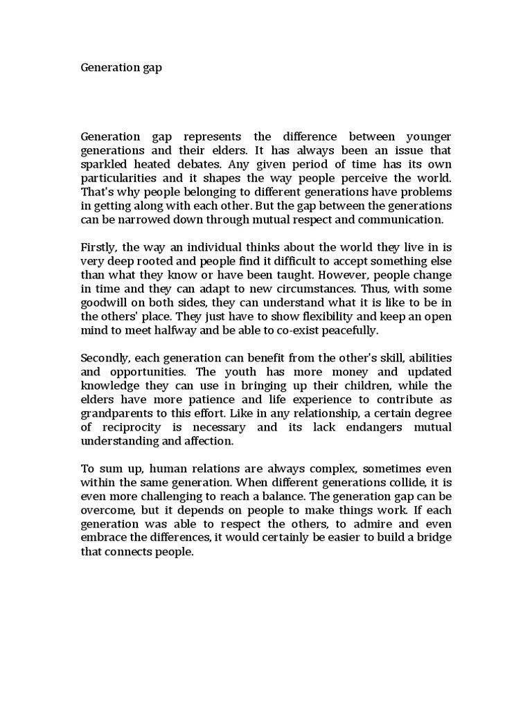 Besides, the younger generations should accept themselves as followers. They need to be willing to show that they are trainable, flexible, and need to be self-motivated and express themselves. To sum up, to diminish the generation gap, essay about generation gap, we need to be open-minded about learning from other generations. Frequently, there is a stain within each generation; younger or older generations are wrong.